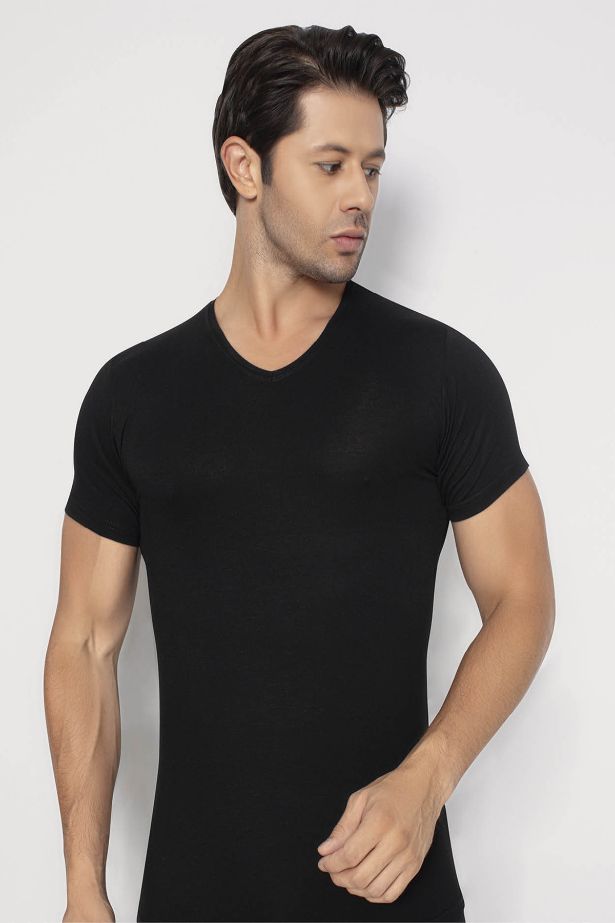 Erkek Bambu Tişört V Yaka Kısa Kol Siyah