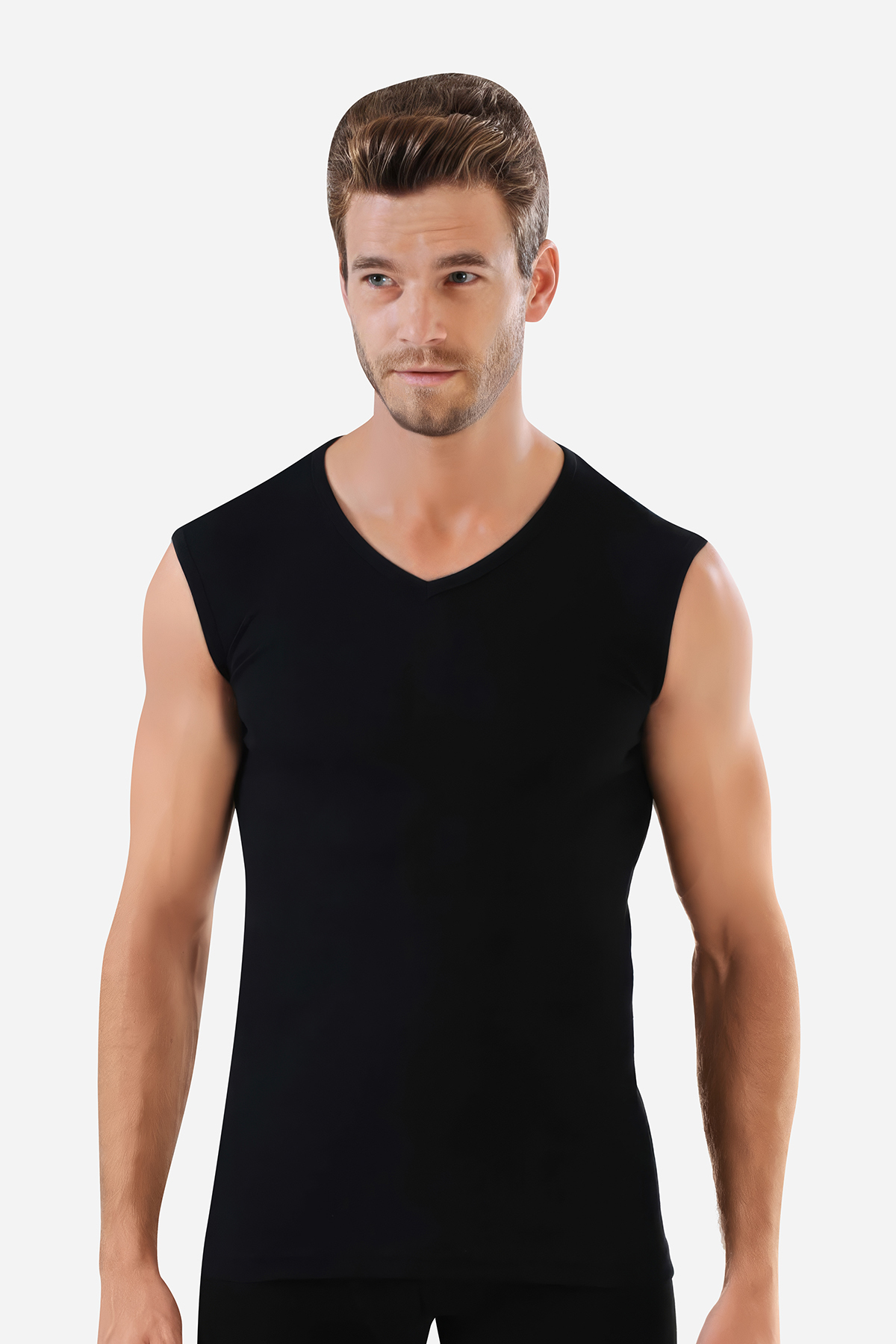Erkek Siyah Pamuklu Tişört Sıfır Kol V Yaka Kolsuz Atlet
