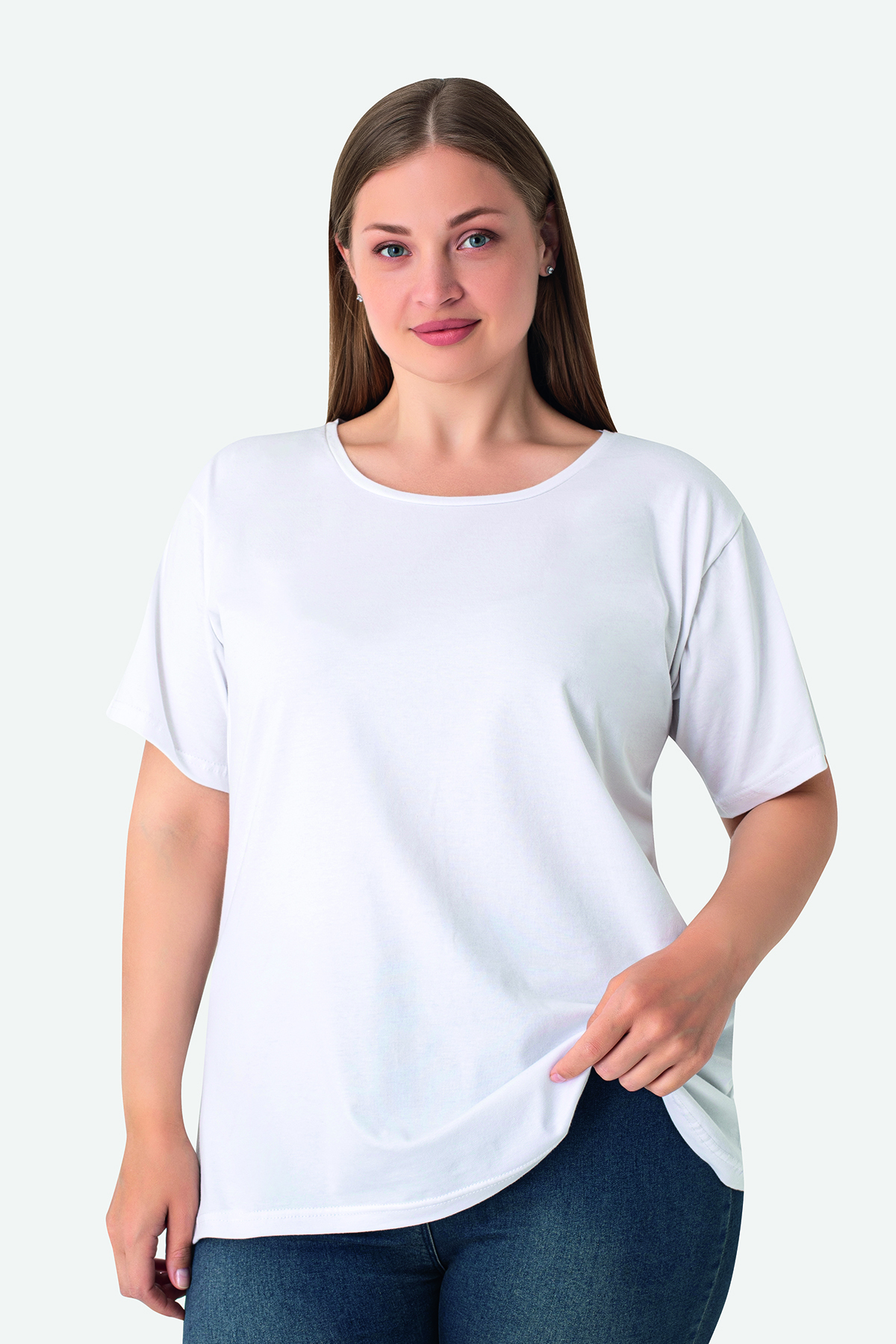 Kadın Beyaz Büyük Beden Bisiklet Yaka Pamuklu Likralı Esnek Kısa Kollu Tişört