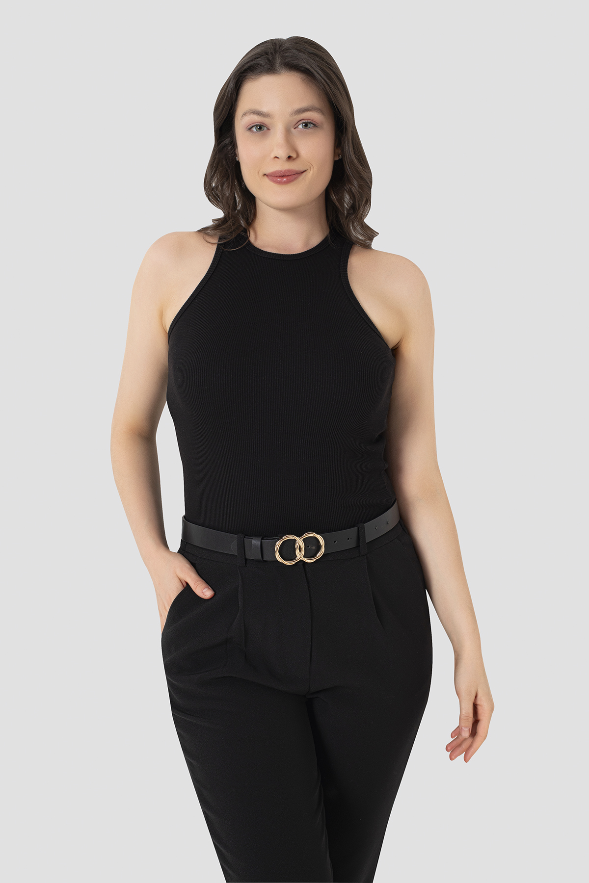 Kadın Fitilli Görünümlü Tişört Halter Yaka Siyah Atlet