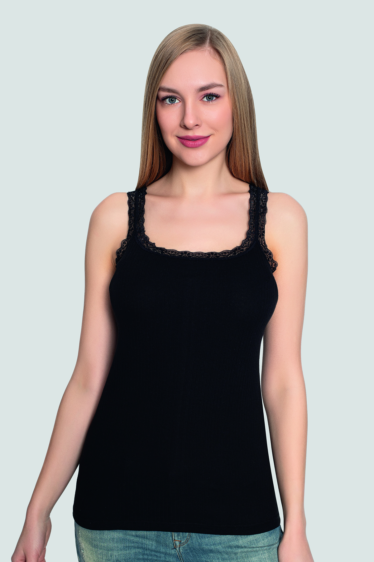Siyah Kadın İnce Askılı Dantelli Atlet %100 Pamuk