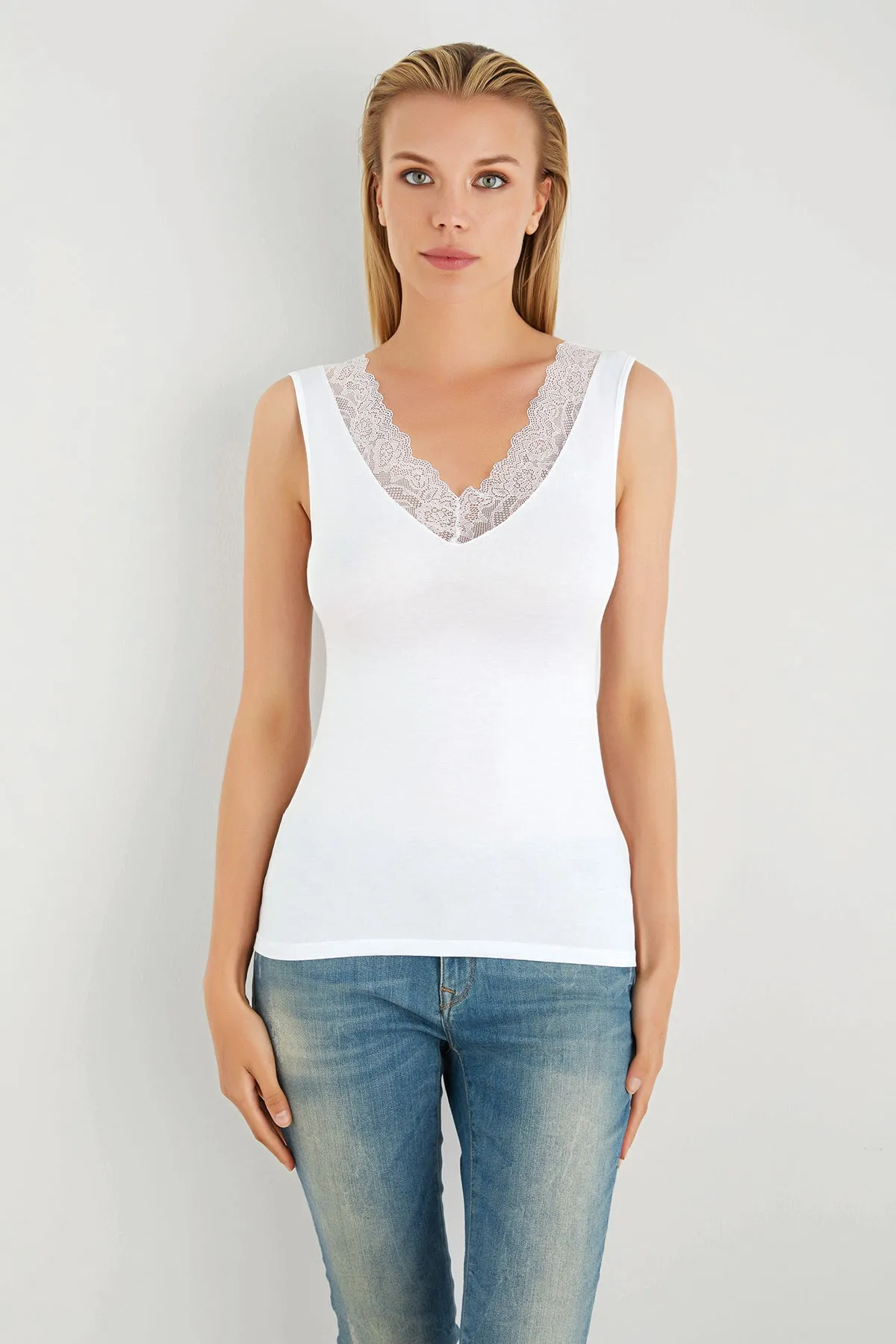 Kadın Dantelli V Yaka Sıfır Kol Tişört